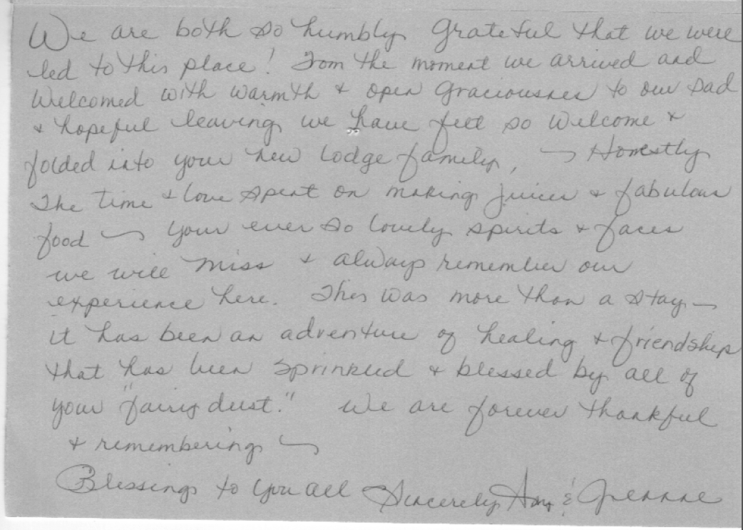Diane S.Both Amy and I feel so much better after having spent time with you all. The energy there was almost always so conducive to healing and health. The very special energy that was present in the lovely food prepared especially by Devon, Annie and Joey was top notch.